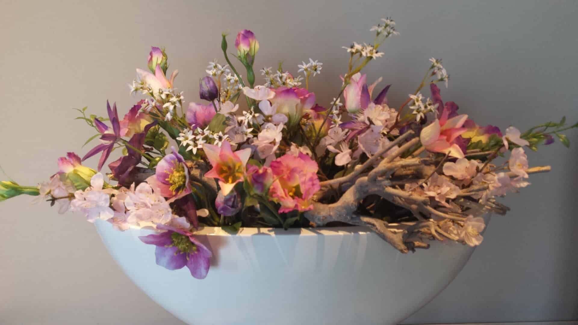 In het bloemstuk zitten lysianthus, tulpen, helleborus, bloesems, clematis en vogelmelk en een vergrijsde tak. Het geheel is fleurig en heeft een koel-roze en daardoor frisse uitstraling.