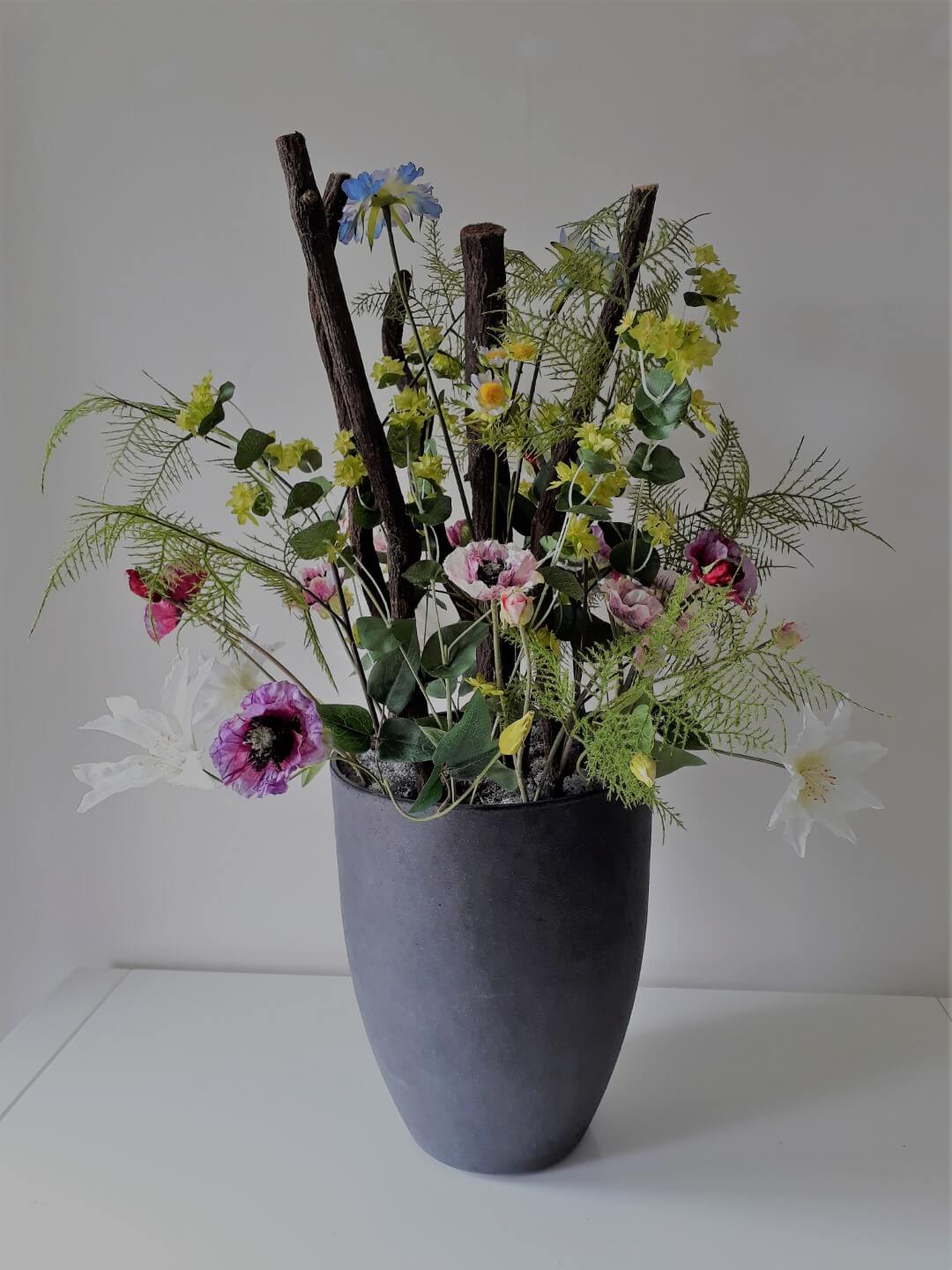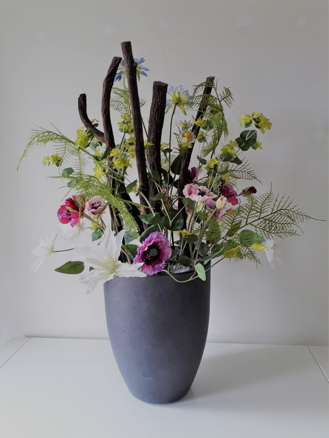 Bloemstuk met liaantakken, clematis, vrouwenmantel, scabiosa etc. in een betonlook antarciet-kleurige pot. Het stuk is 90 cm hoog en heeft een diameter van 50 cm.