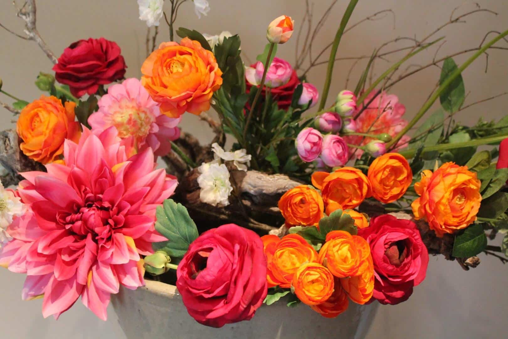 Huurprijs per maand inclusief pot. Het bloemstuk bevat oranje, rozeĀ en rode ranonkels, druivenhout, groen en bloesem.