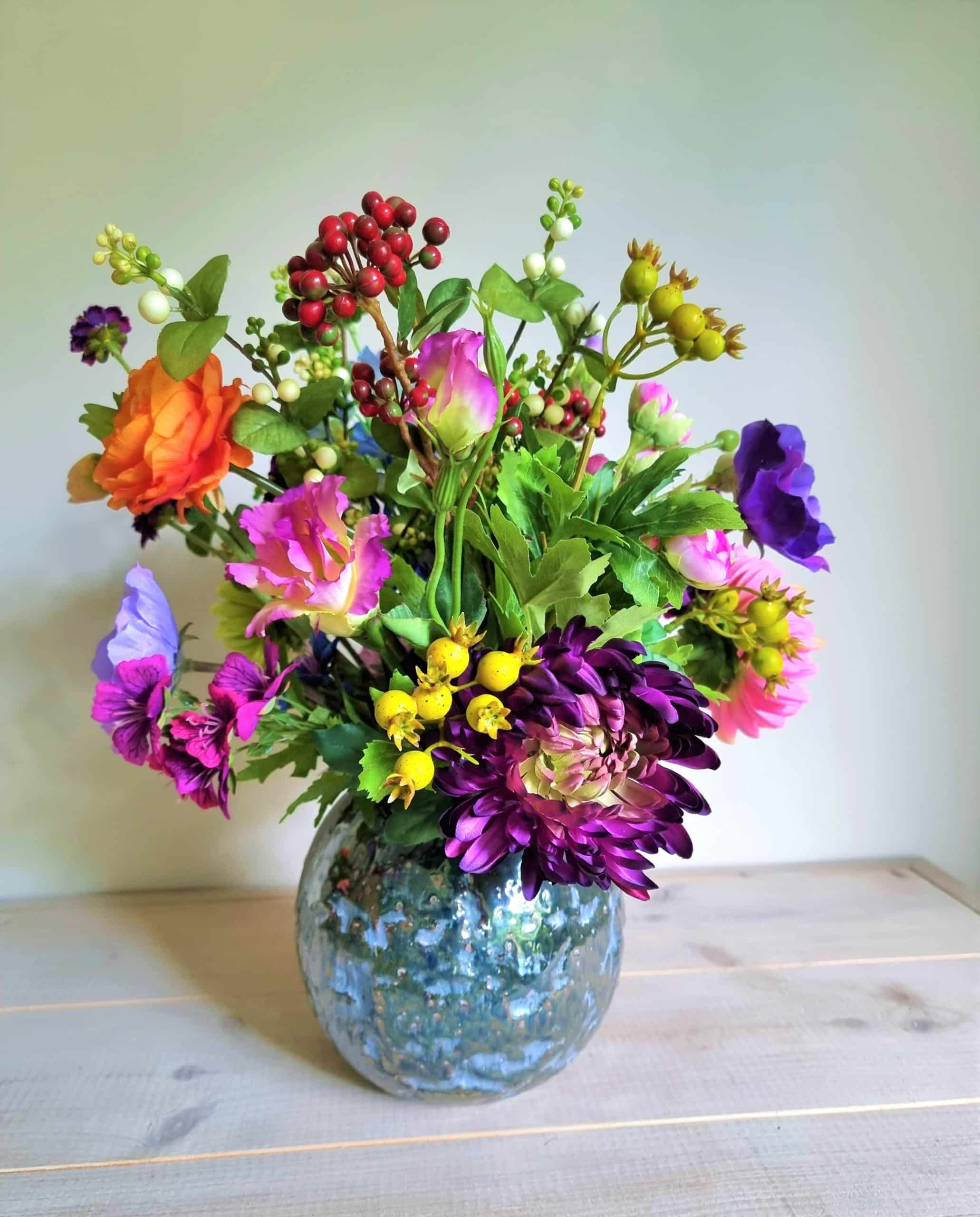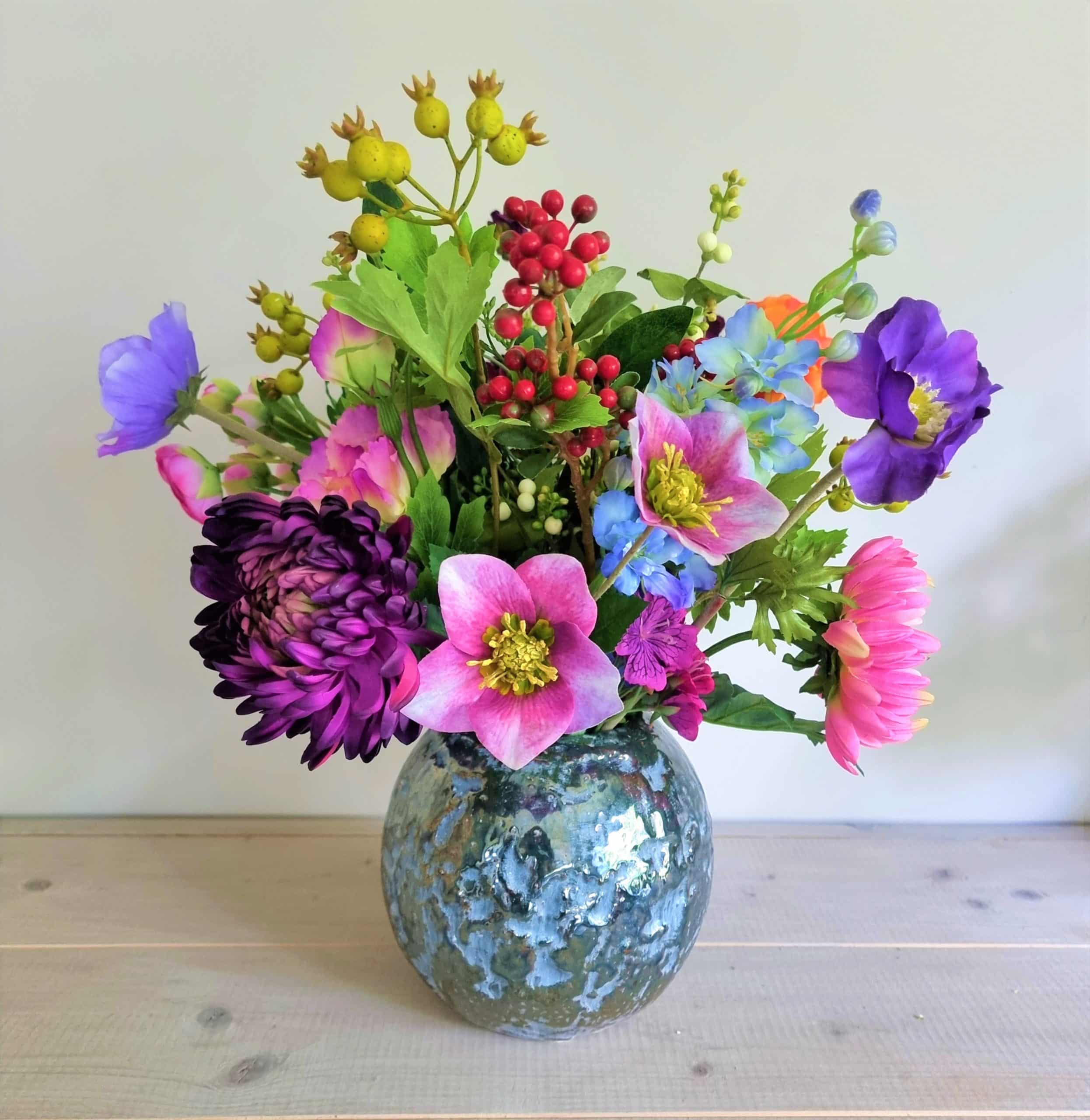 Mooi volĀ fleurig boeket inclusief vaas in warme tinten met chrysanten, bessen, helleborus, ranonkel etc. Deze maat is ideaal voor op de eet- of salontafel .