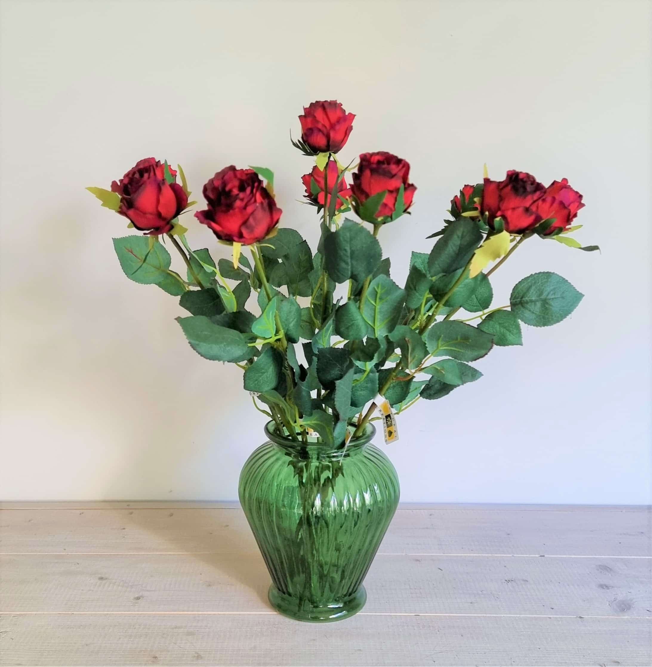 In alle vazen wordt het zicht op de stelen gebroken. De vazen hebben de ideale maat en vorm voor een bos bloemen. De vaas met de rozen samen is 42 cm hoog. Een mooi basisboeket waar b.v. ook varens en/of andere bloemen aan toegevoegd kunnen worden.