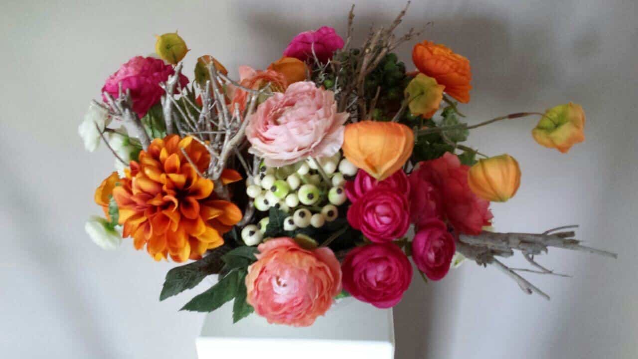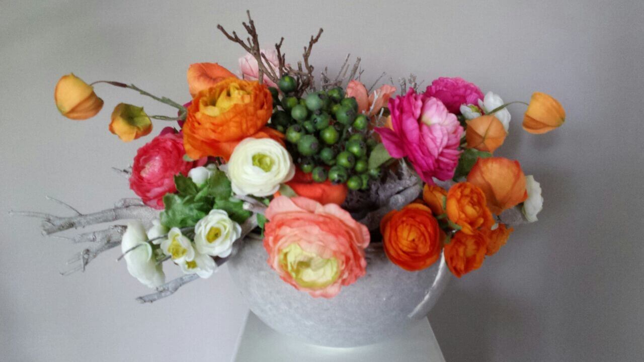 Zijden bloemstuk, te huur voor € 29,95 per maand. Op afspraak wisselen wij om de 3 maanden van bloemstuk zodat uw elk seizoen verzekerd bent van een prachtig bloemstuk in uw zaak.