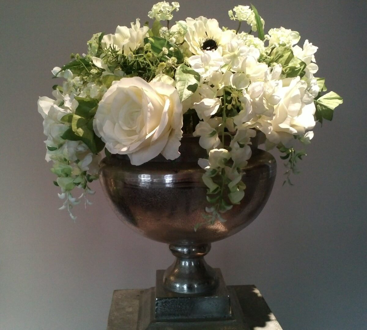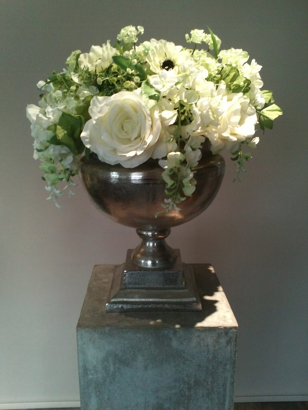 Zijden bloemstuk met witte rozen, klaprozen, viburnum (sneeuwbal) wisteria (blauwe regen) en groendecoratie